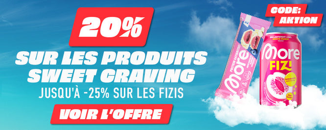* La comparaison a été effectuée entre les More Protein Satisbites – Dark Cookie Crumble Flavour (50 g = 2 bites) et une barre chocolatée traditionnelle, sucrée avec du sucre (50 g), sans utilisation d’édulcorants.
